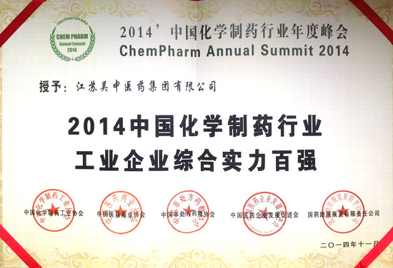 江蘇吳中醫藥集團榮獲“2014年中國化學制藥行業工業企業綜合實力百強”