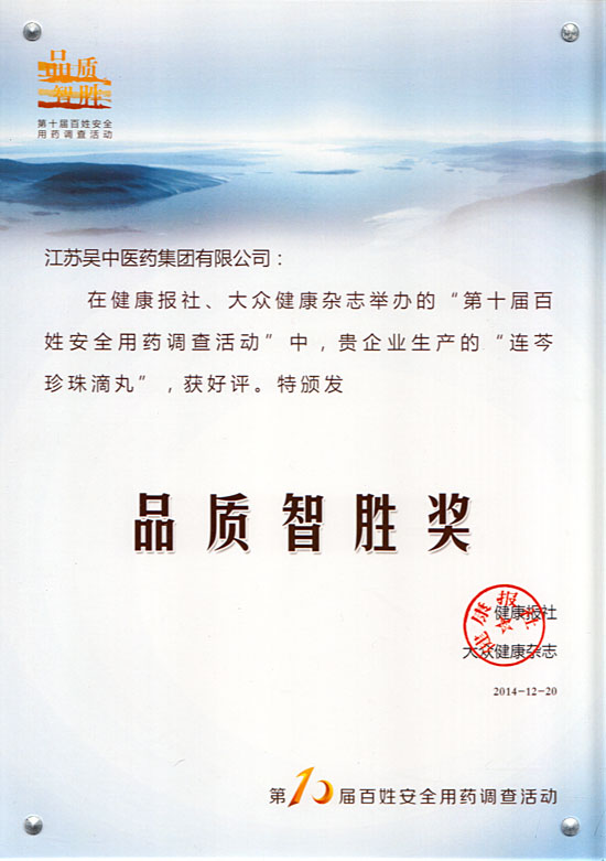 本屆“百姓安全用藥”調查活動,主題定為“品質智勝 守護生命”,通過《健康報》、健康報網、搜狐網健康頻道、39健康網等媒體公開發布調查問卷,內容圍繞百姓對安全用藥知識掌握程度、百姓用藥需求等方面展開。通過公眾自主投票,江蘇吳中醫藥集團“連芩珍珠滴丸”榮獲“品質智勝獎”。