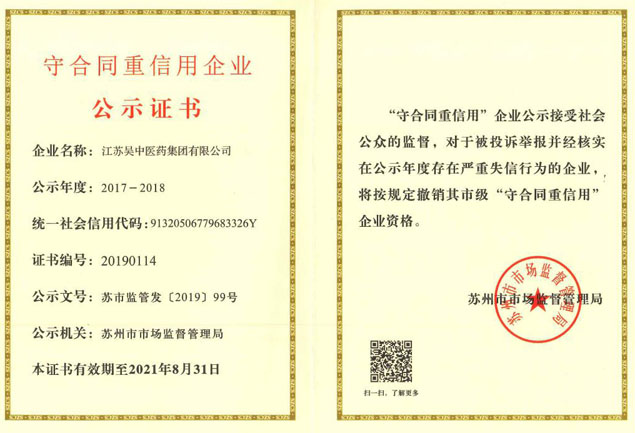 江蘇吳中醫藥集團有限公司獲得蘇州市“守合同重信用”企業