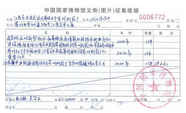 2020年4月17日,江蘇吳中醫藥集團收到中國國家博物館文物(圖片)征集收據,國務院應對新冠疫情聯防聯控機制(醫療物資保障組)向該企業發出的緊急任務調運單、蘇州市紅十字會頒發的捐贈證書以及吳中醫藥生產的特效“抑制藥”阿比多爾片三件物品被征集,未來將作為文物進行展出,公司抗疫貢獻再次被認可。