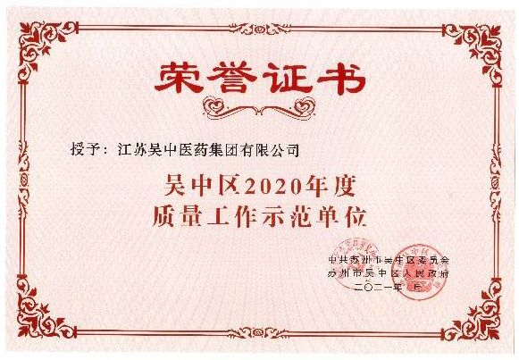 江蘇吳中醫藥集團有限公司獲評吳中區2020年度地標型科技企業、吳中區2020年度制造業轉型升級先進企業(產業龍頭標桿企業)、吳中區2020年度質量工作示范單位等多項榮譽。