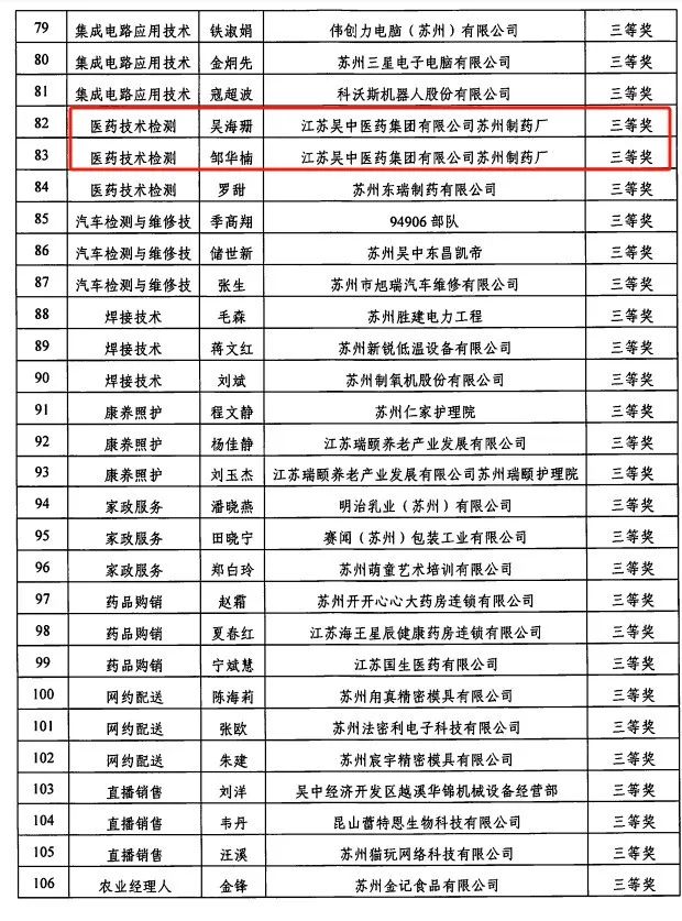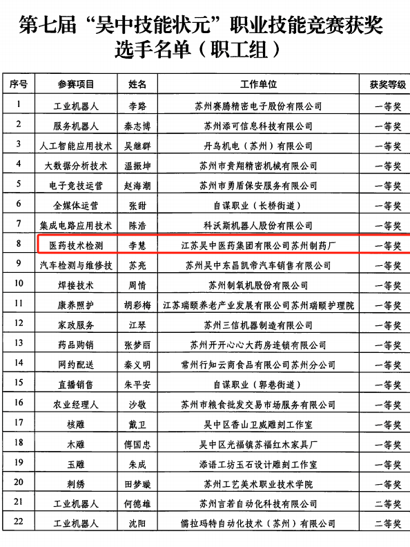 公司參賽選手嚴格遵守競賽規則,奮力拼搏,蘇州制藥廠質量保障部李慧榮獲醫藥技術檢測一等獎,質量保障部吳海珊和生產部鄒華楠榮獲醫藥技術檢測三等獎。江蘇吳中醫藥集團有限公司蘇州制藥廠榮獲“吳中區高技能人才培養貢獻獎”。