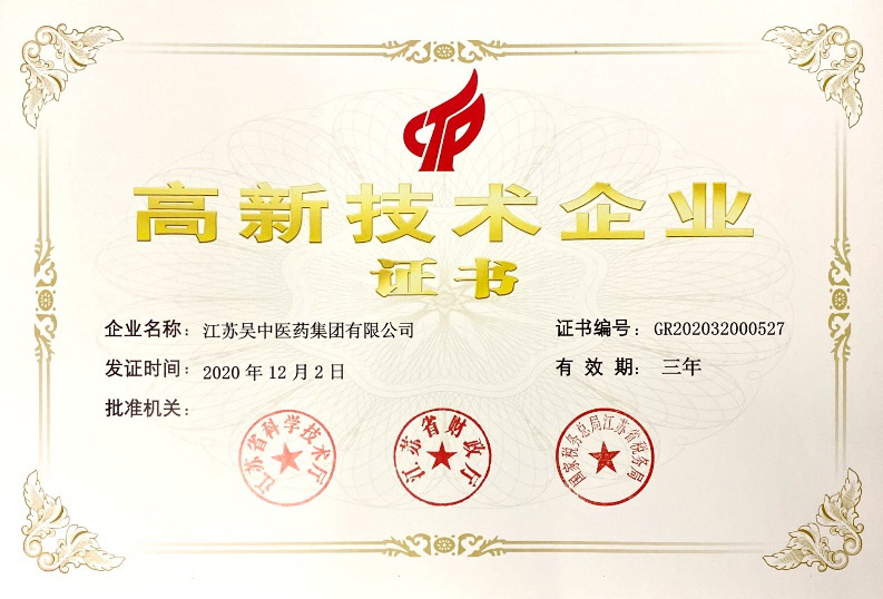吳中醫(yī)藥獲評江蘇省高新技術(shù)企業(yè)