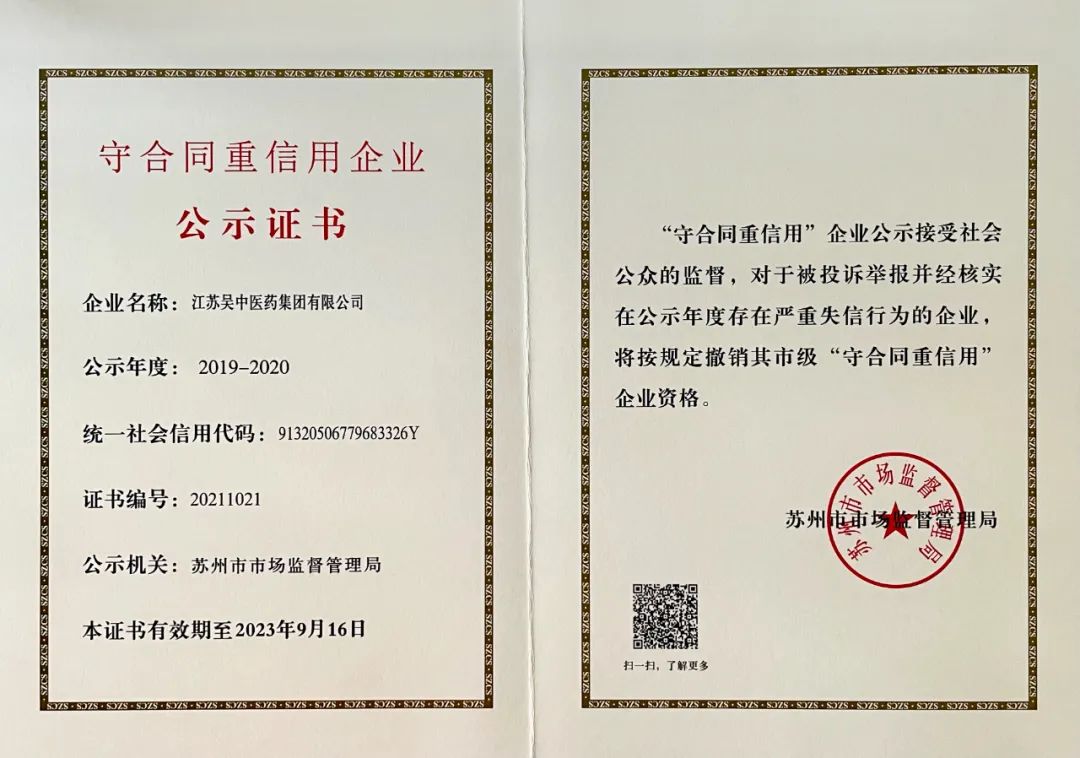 吳中醫(yī)藥再度獲評蘇州市“守合同重信用”企業(yè)