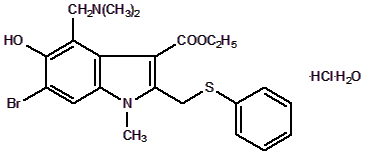 其化學名稱:6-溴-4-(二甲氨基甲基)-5-羥基-1-甲基-2-(苯硫甲基)-1H-吲哚-3-羧酸乙酯鹽酸鹽一水合物。